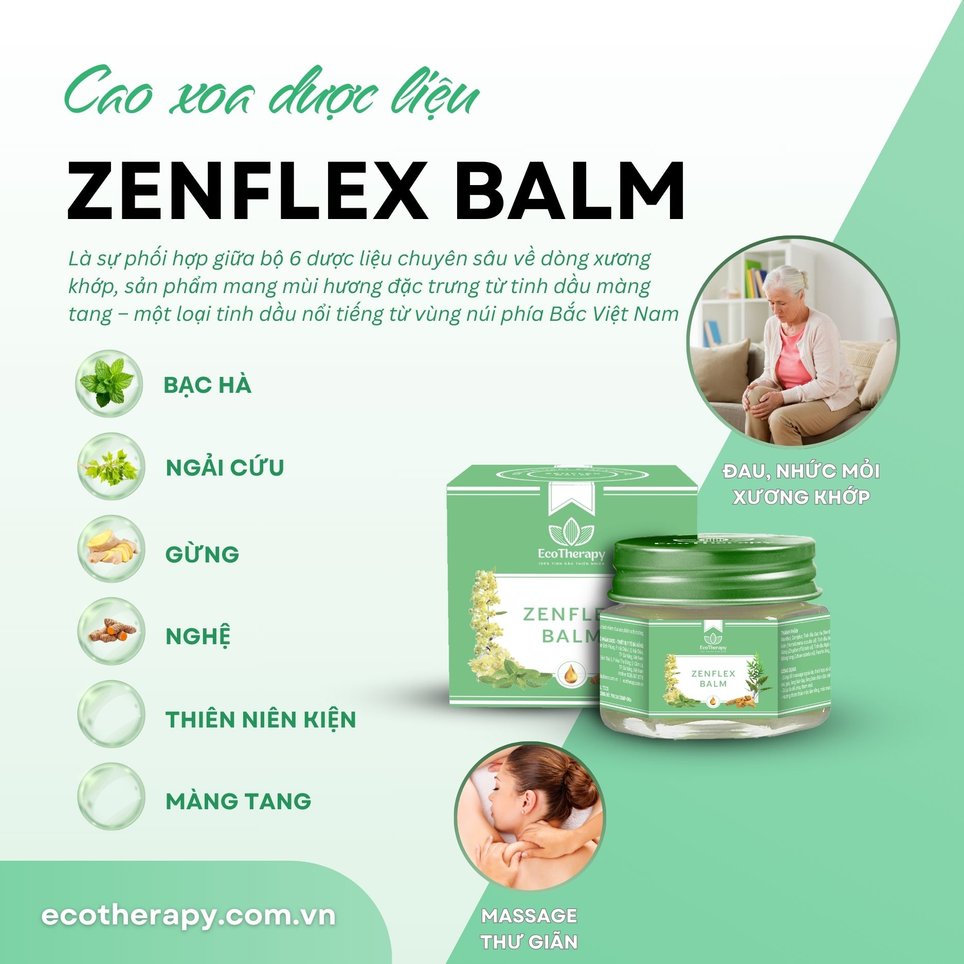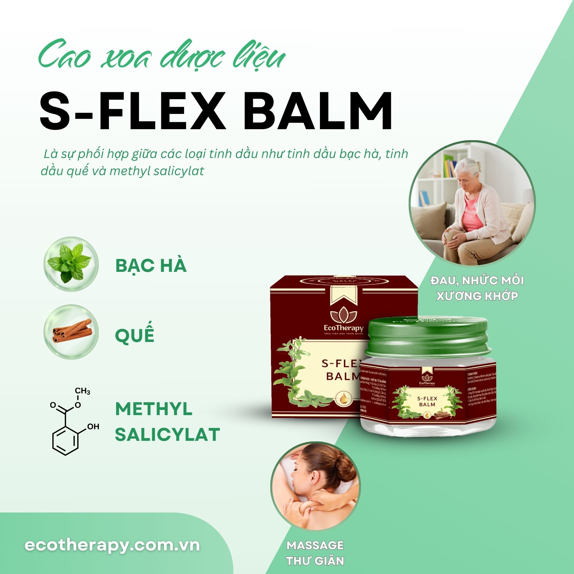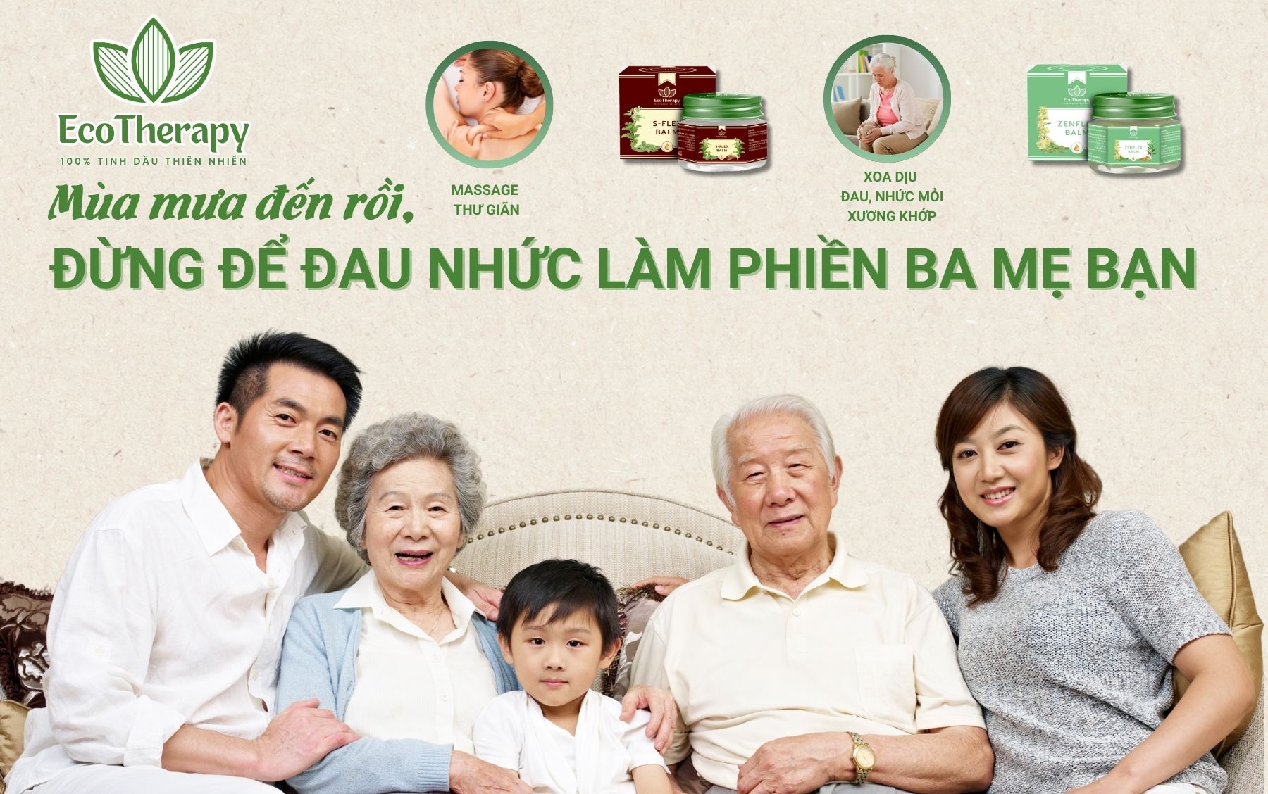 Cao xoa dược liệu EcoTherapy không chỉ là sản phẩm chăm sóc sức khỏe, mà còn là một món quà chứa đựng tình yêu dành cho ba mẹ. Với hai dòng sản phẩm chủ đạo: S-FLEX BALM và ZENFLEX BALM, EcoTherapy mang đến giải pháp toàn diện, giúp giảm đau, thư giãn và giữ ấm cơ thể.
